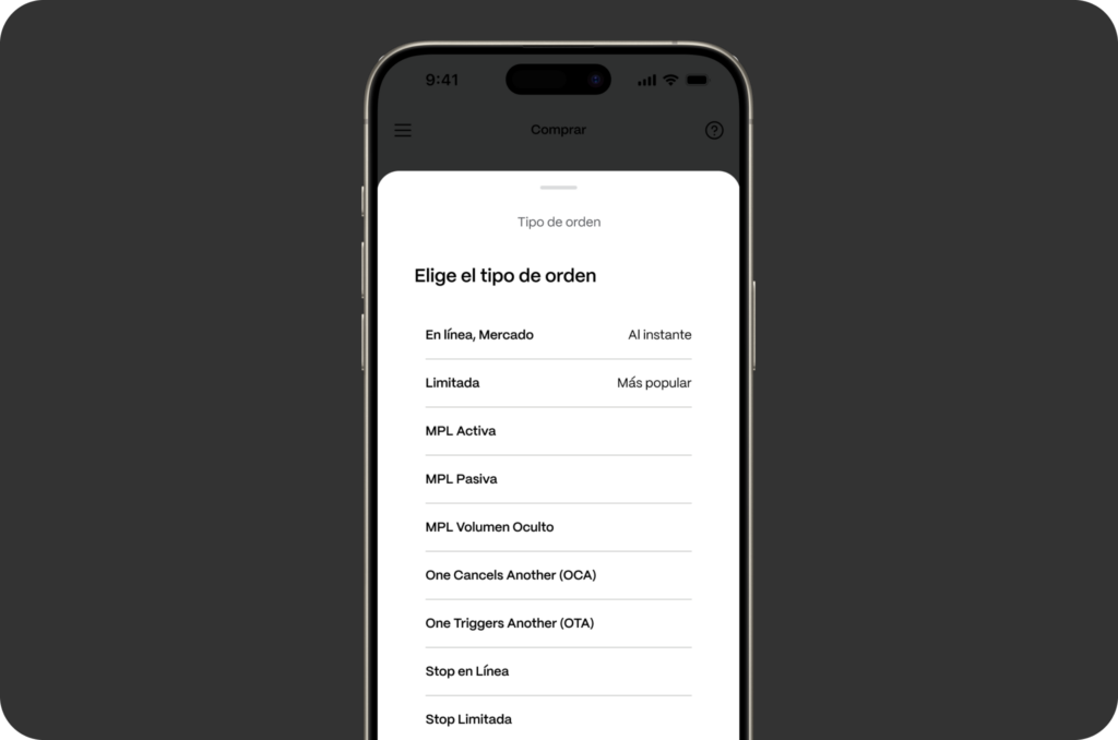 7. Tipos de órdenes. Ahora tu forma de hacer Trading puede ser tan compleja como desees. Ponemos a tu disposición todos los tipos de órdenes en la aplicación web y móvil para que tengas una experiencia de Trading completa. Podrás enviar órdenes Trailing Stop, MPL Activa, MPL Pasiva, One Cancels Another, entre otras.